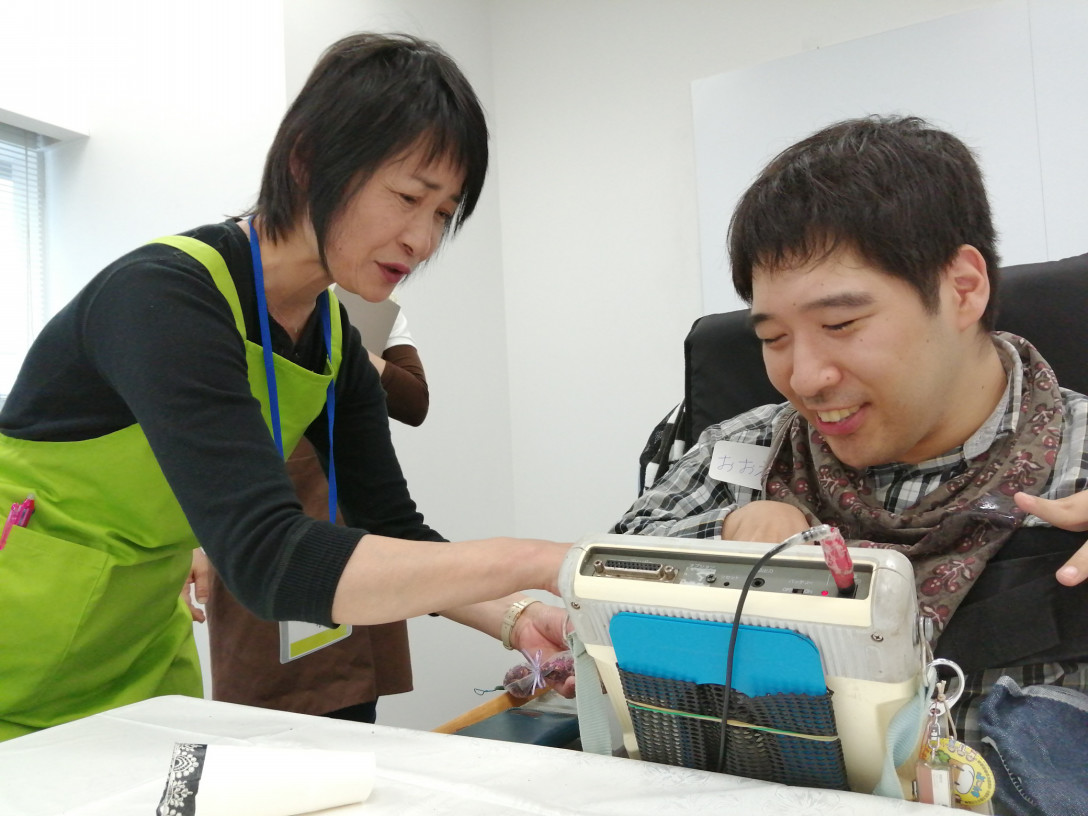 アロマポプリを詰めるときに、障害のある3人がレースを持つなど、それぞれに合った参加方法で楽しみながら作品を作っていました。